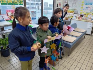 今年も、勤労感謝の日を覚えて沢山の職場を訪問しました。いつも私たちのために大切なお仕事をしてくださっている方々に感謝の気持ちを込めて、お花や自分たちで作ったのれんやクッキーをお渡ししました。